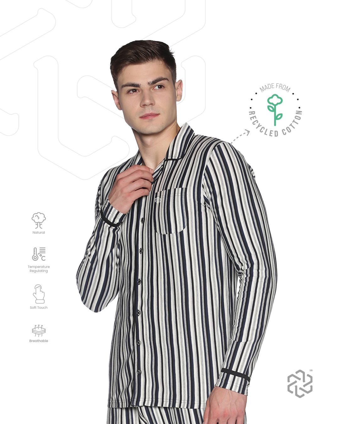 استرخِ بأناقة مع طقم البيجامات الرجالي المصنوع من القطن المعاد تدويره، المصمم لتوفير أقصى درجات الراحة ولمسة من الأناقة. يتميز هذا الطقم بقماش قطني معاد تدويره ناعم وجيد التهوية لراحة طوال الليل، مما يضمن نومًا هادئًا. يضيف النمط المخطط المصبوغ بالخيوط مظهرًا عصريًا وخالدًا، مثاليًا للاسترخاء في المنزل أو الاسترخاء بعد يوم طويل.