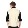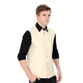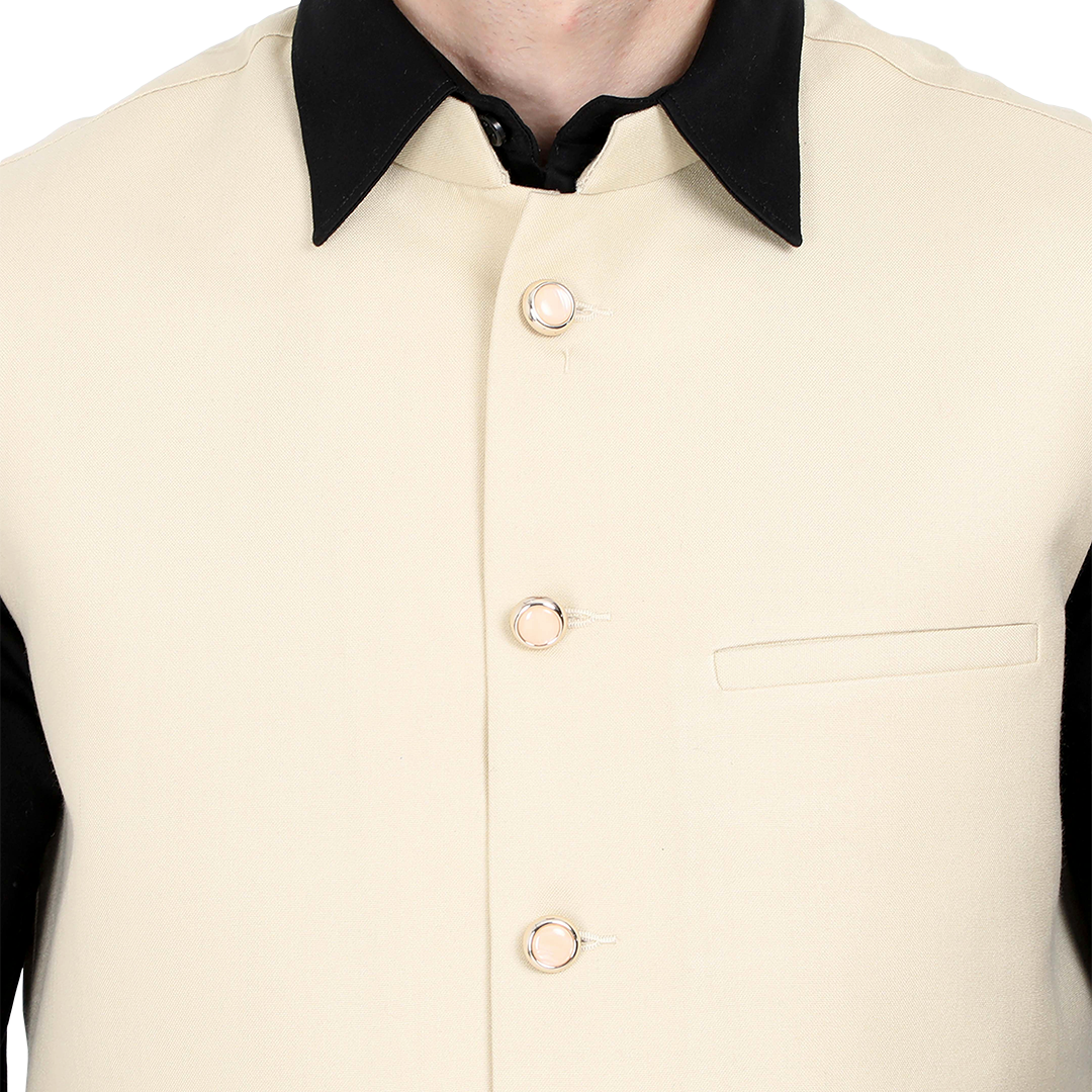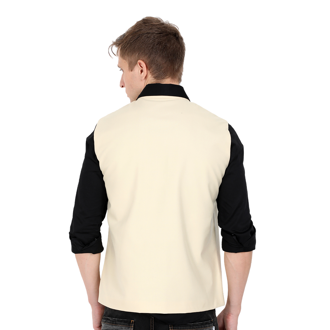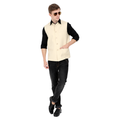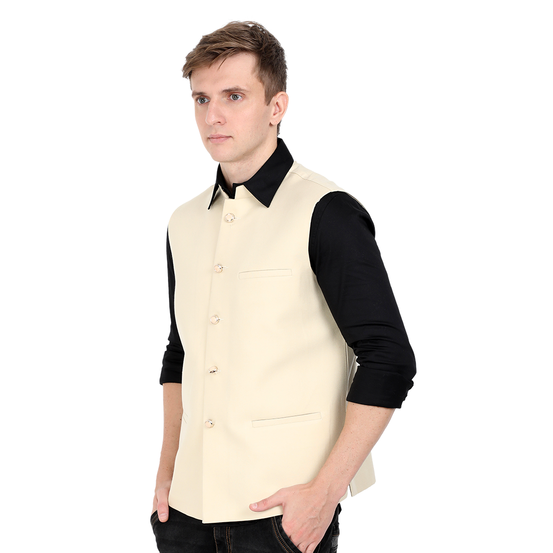 Mandarin collared sleeveless jacket with three pockets, set for a semi formal wear with full shirts or kurtas. Comes in stunning oat meal and soft white colours