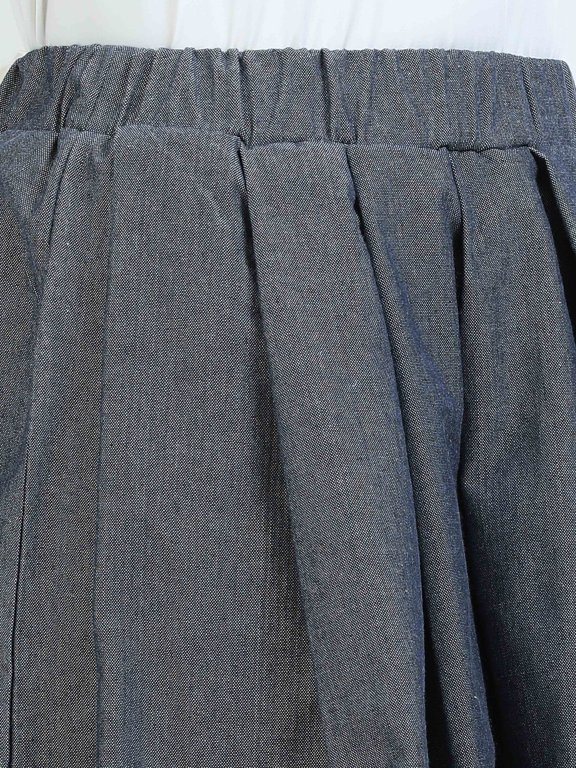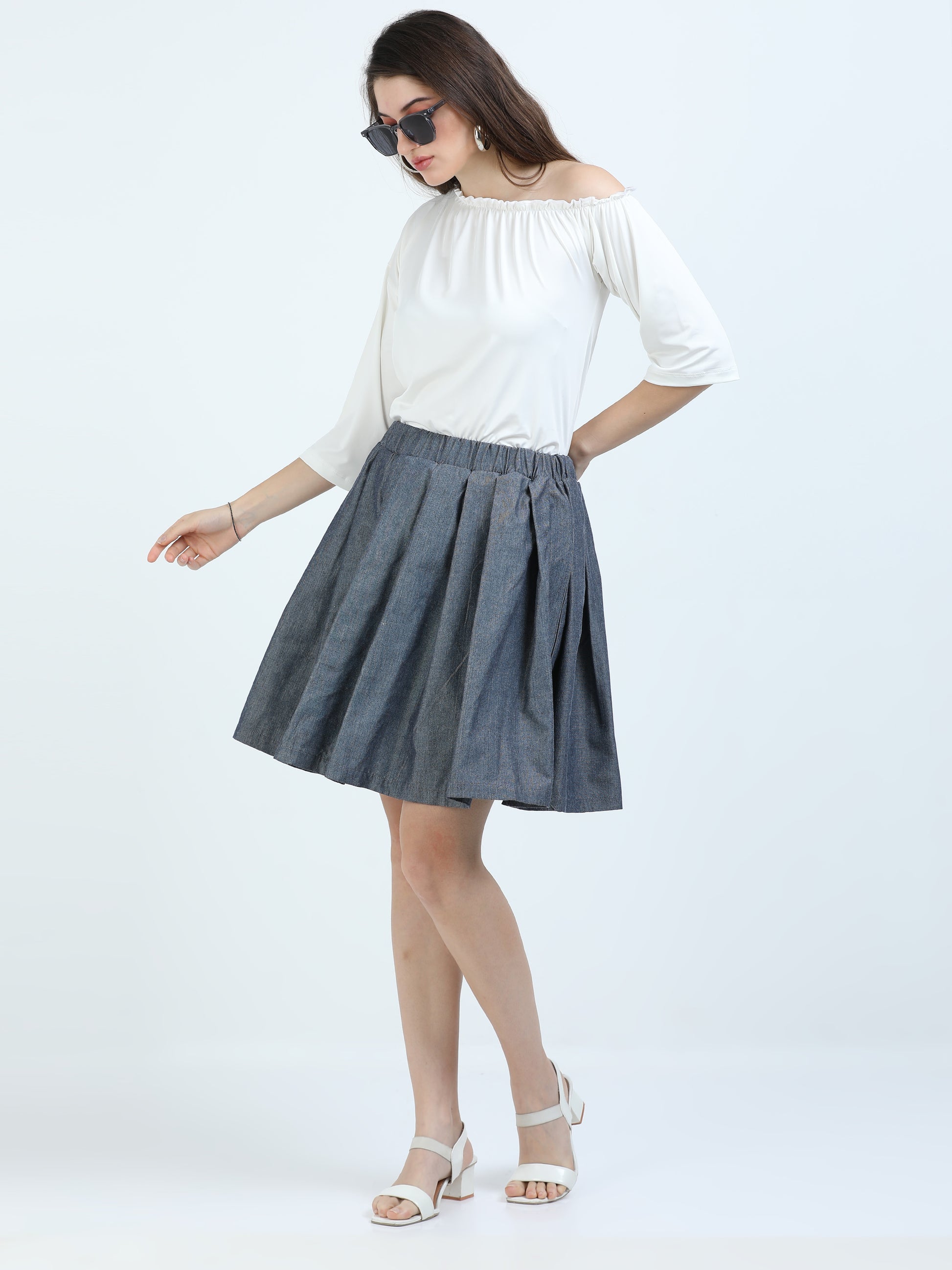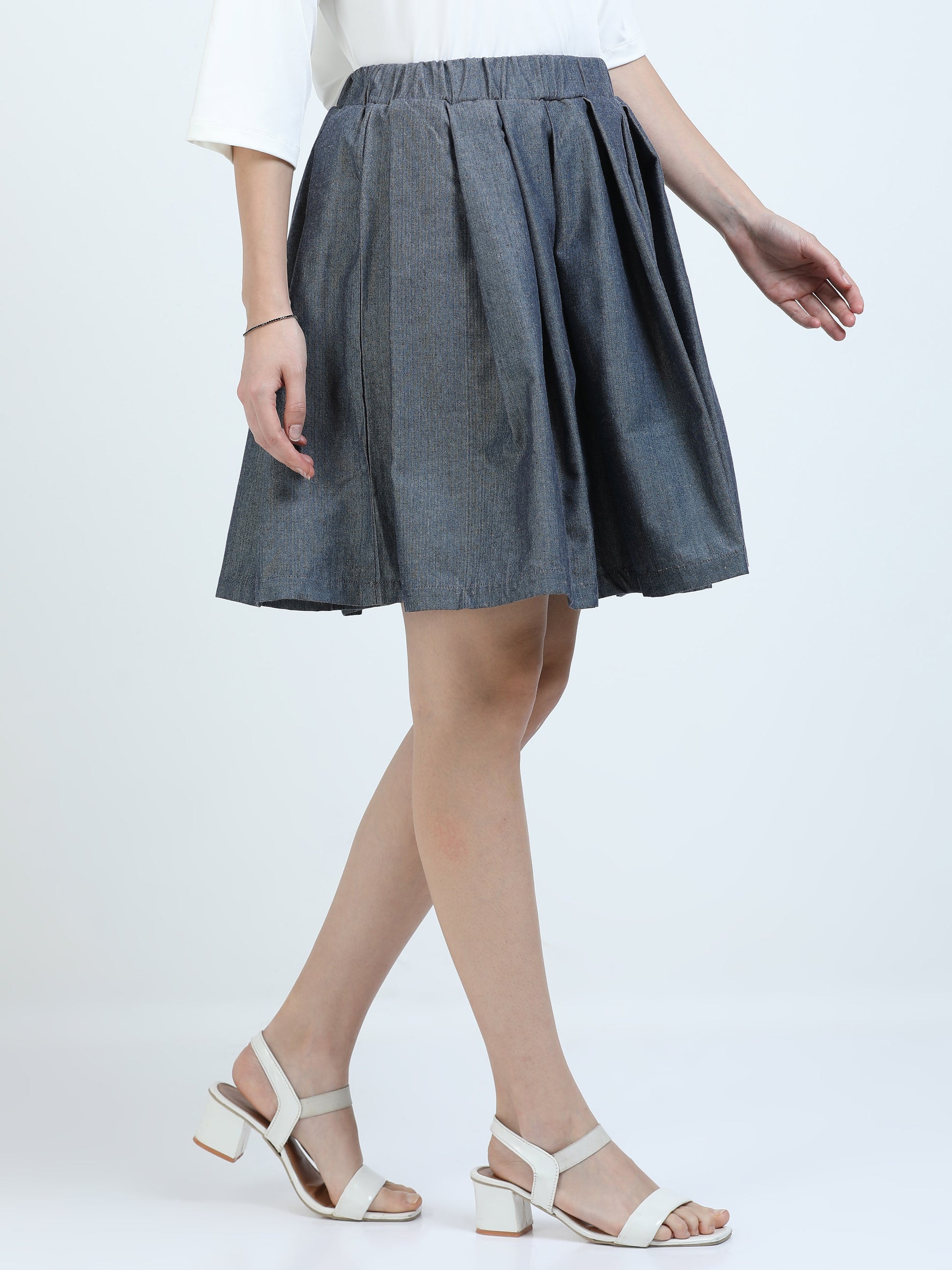 Step out in style with this below knee length skirt featuring stylish box pleats for a chic yet timeless look. The structured box pleats create the perfect amount of fullness, giving the skirt beautiful movement with every step. Designed with a soft elastic waistband and a smooth side closure, it offers both style and comfort. Ideal for pairing with a crisp cotton tee, casual sneakers, or elegant sandals, making it a versatile piece for your wardrobe.