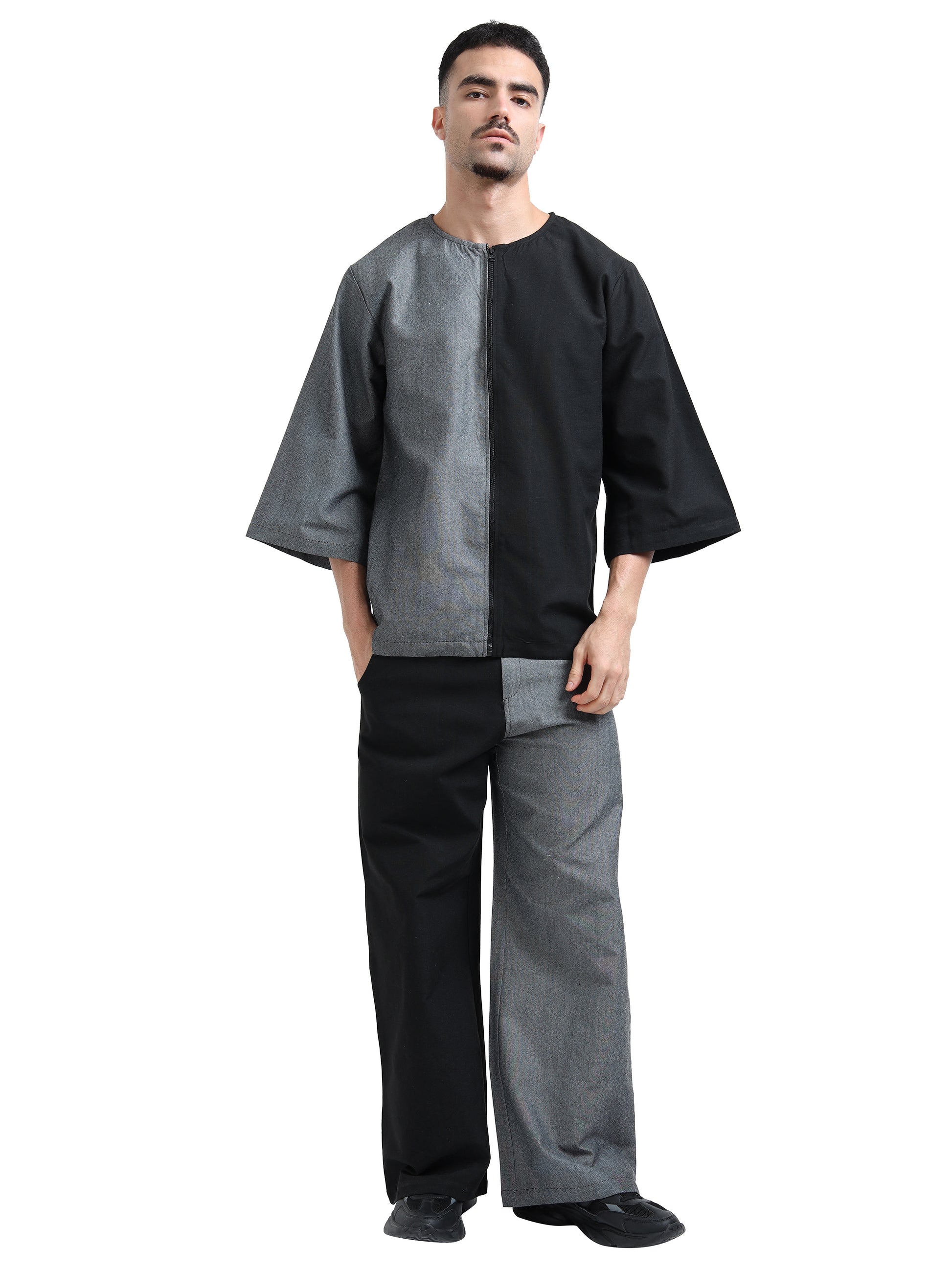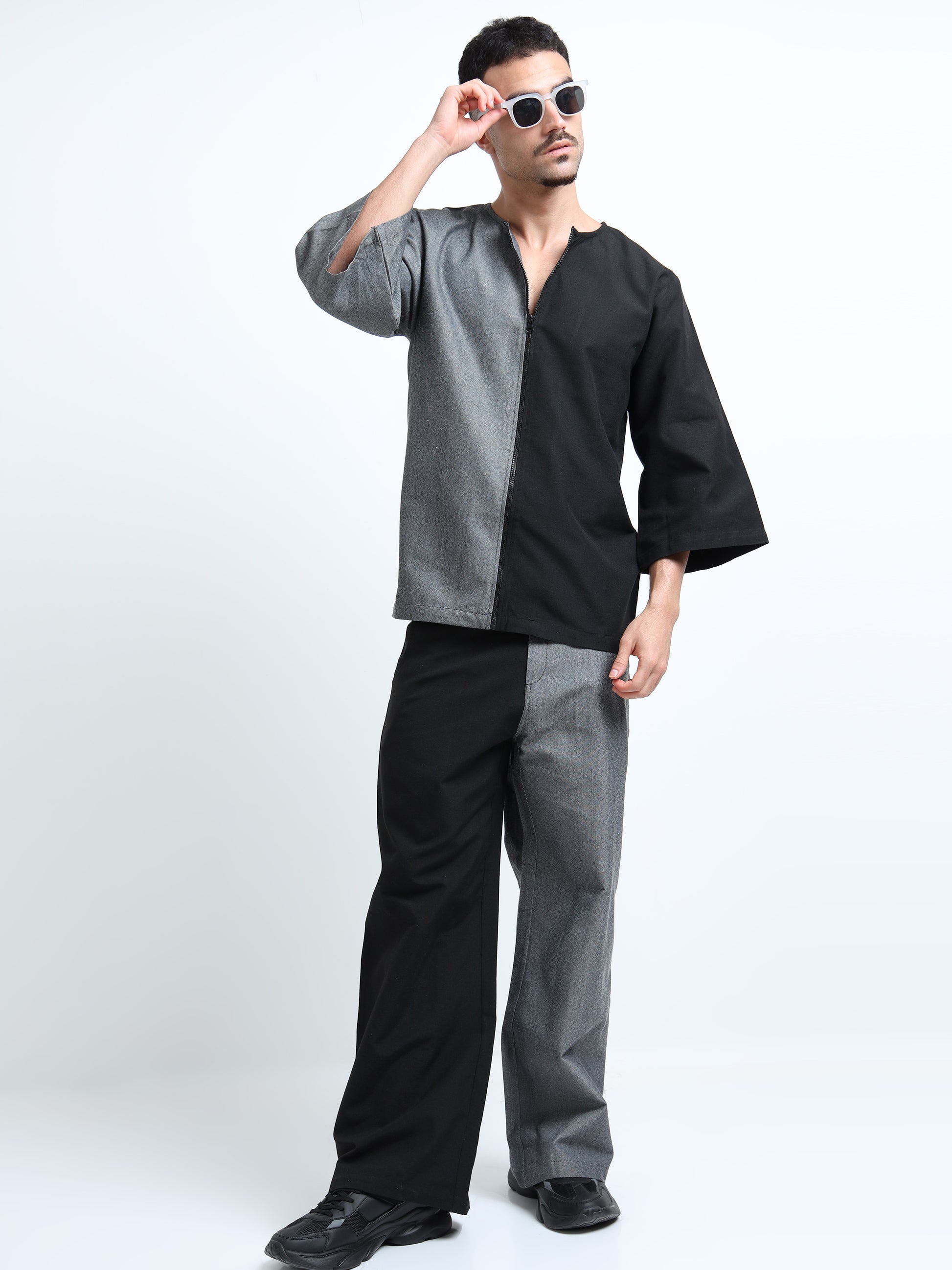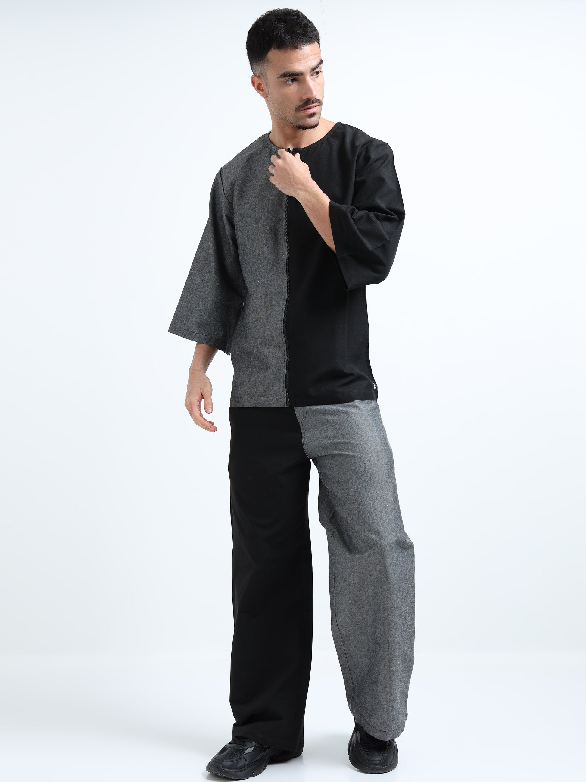 Built for comfort and everyday wear, this zip shirt brings a modern twist to the classic shirt style. Designed with a smooth zipper closure method instead of traditional buttons, it offers both ease and edge in one look. The curved neckline, color-blocked panels, and relaxed sleeves create a striking contrast that works across multiple styles. With its oversized fit and just-below-the-waist length, this versatile zip-up shirt layers effortlessly over polos or pairs well with a jacket for a polished finish. A must-have piece in every wardrobe.