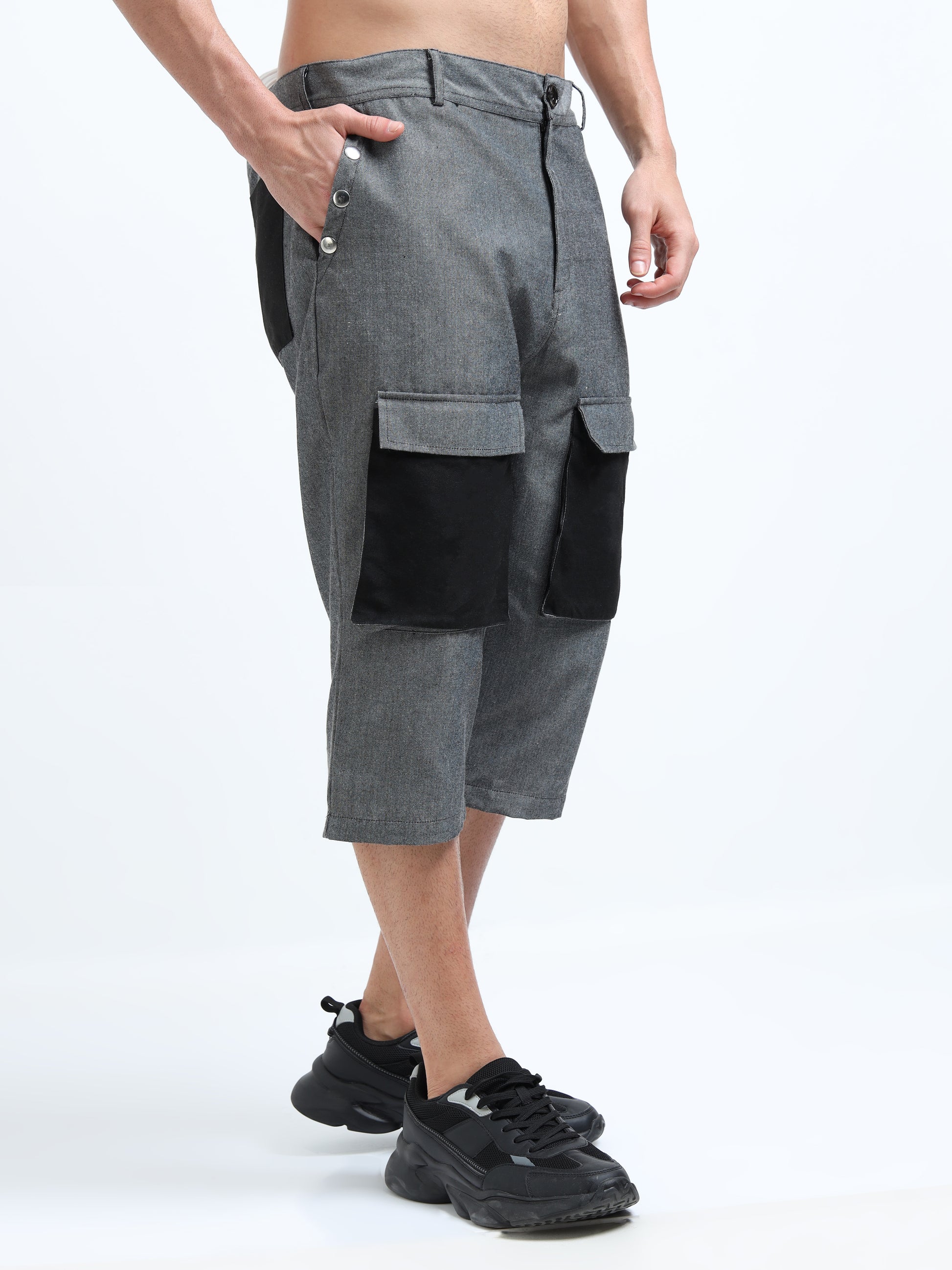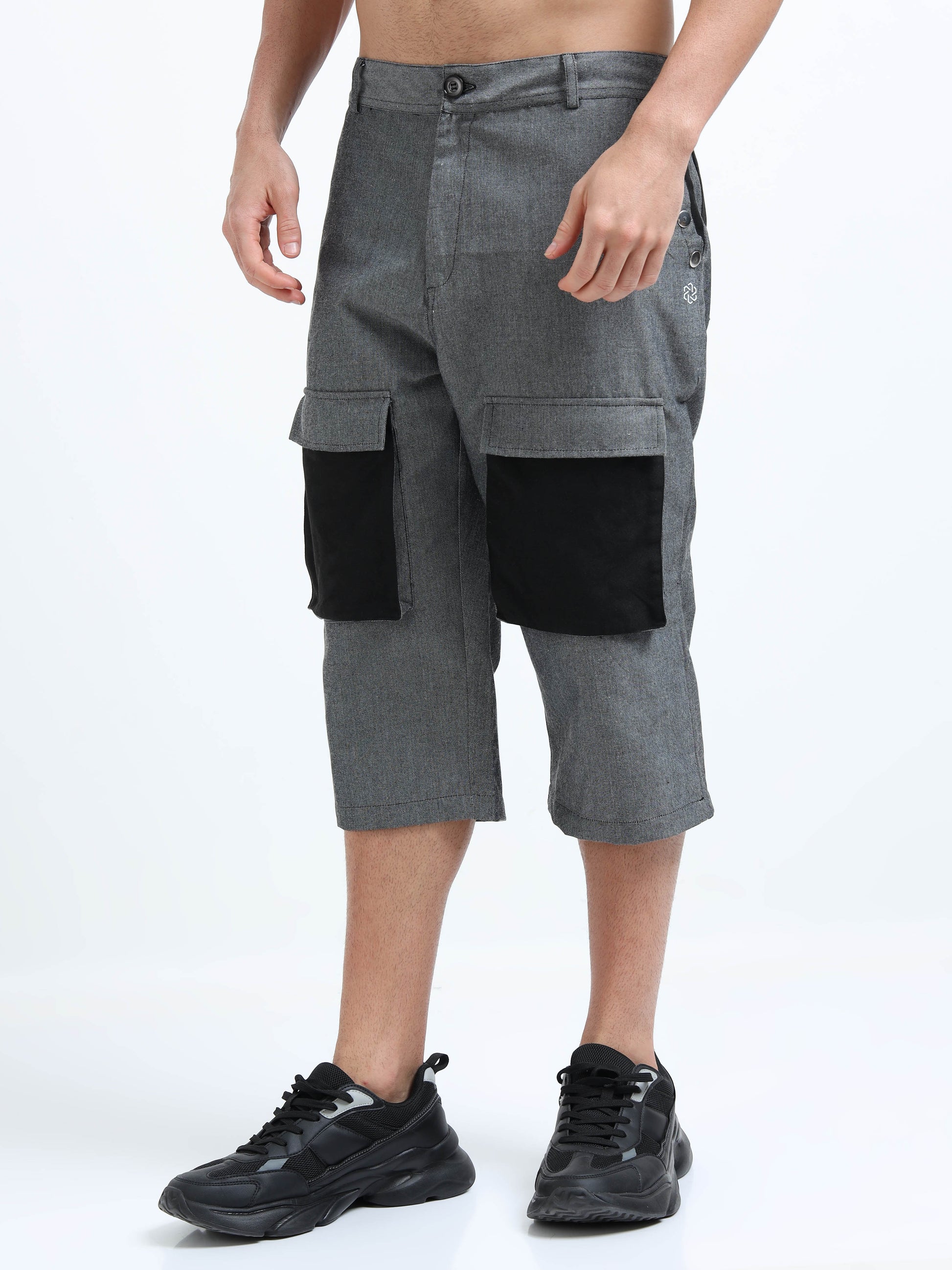 Relaxed and statement making knee length shorts. These Bermuda shorts bring style and utility together. Made with chambray and woven fabric blend and designed with an easy inseam, they feature oversized cargo pockets that are functional yet striking. Style these shorts with a half sleeve shirt, a T-shirt, or a hood for an easy-going, off-duty style.