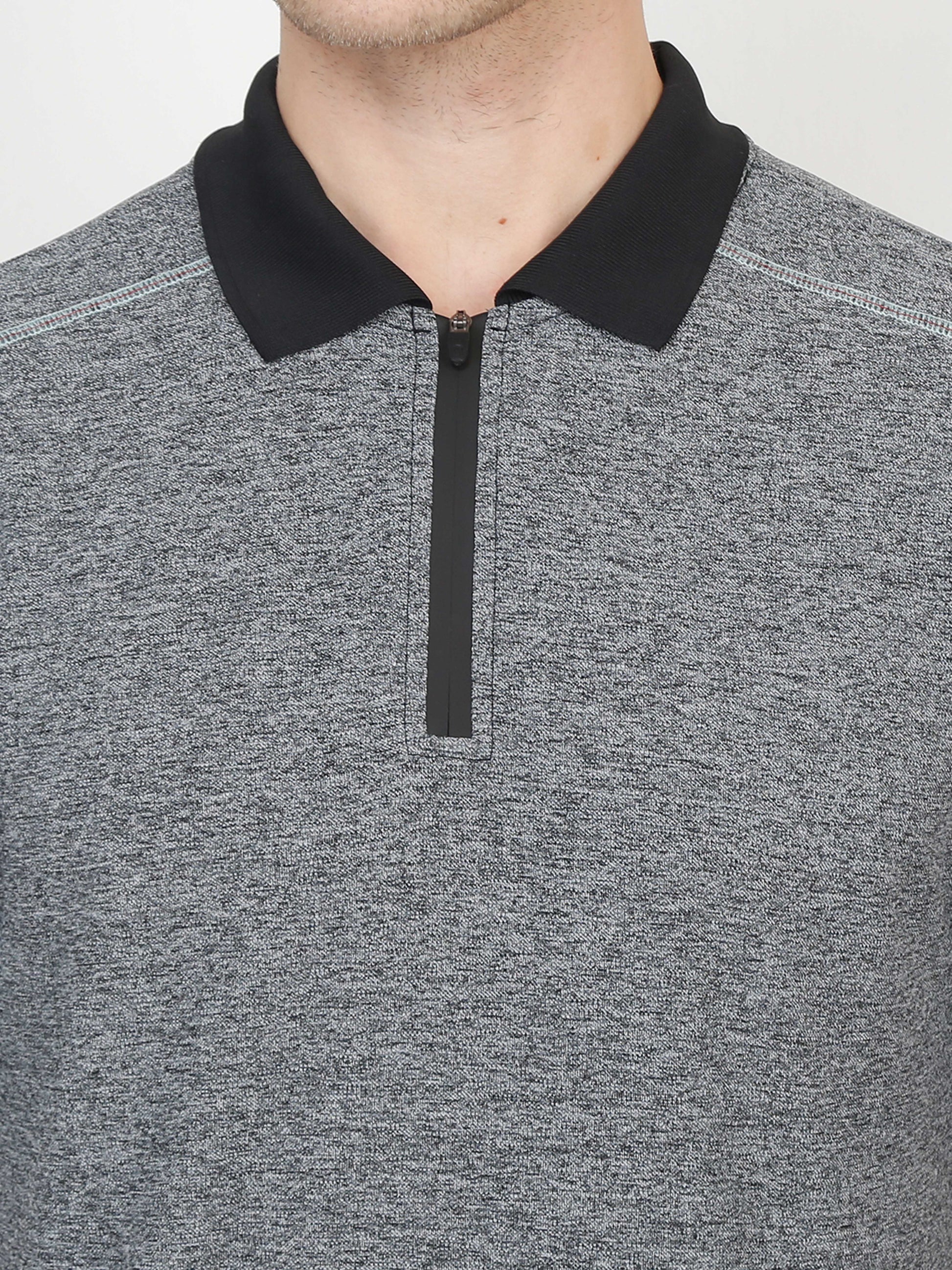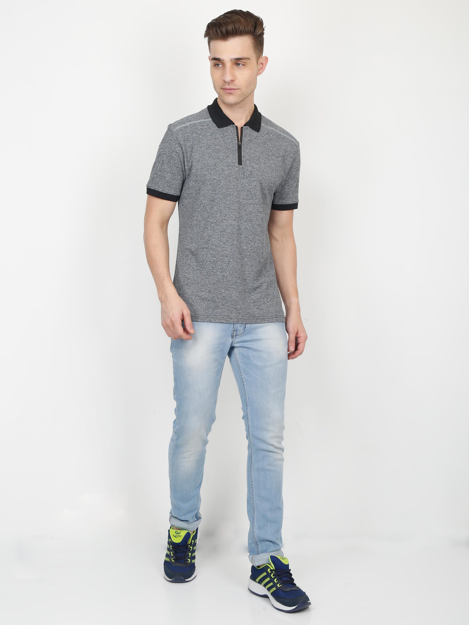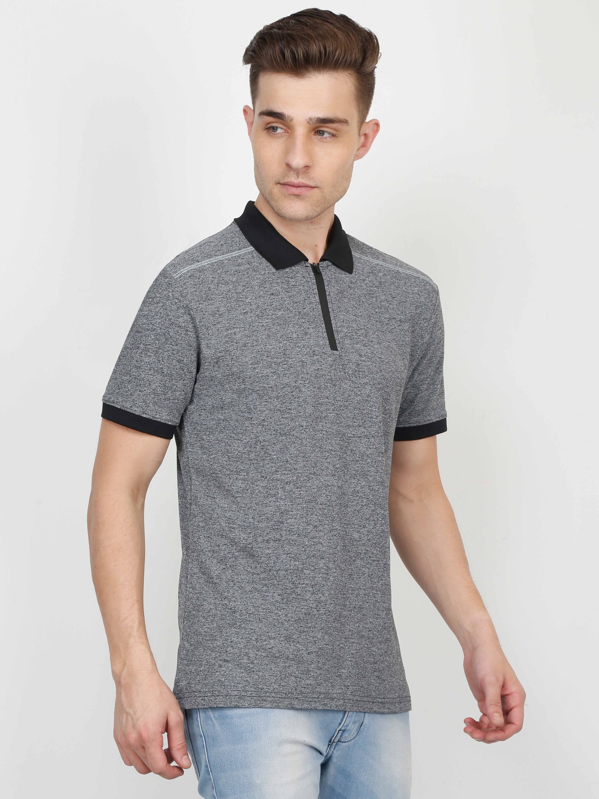 Sporty Men's Polo T-Shirt - Black Melange with Deep Collar