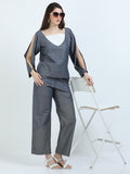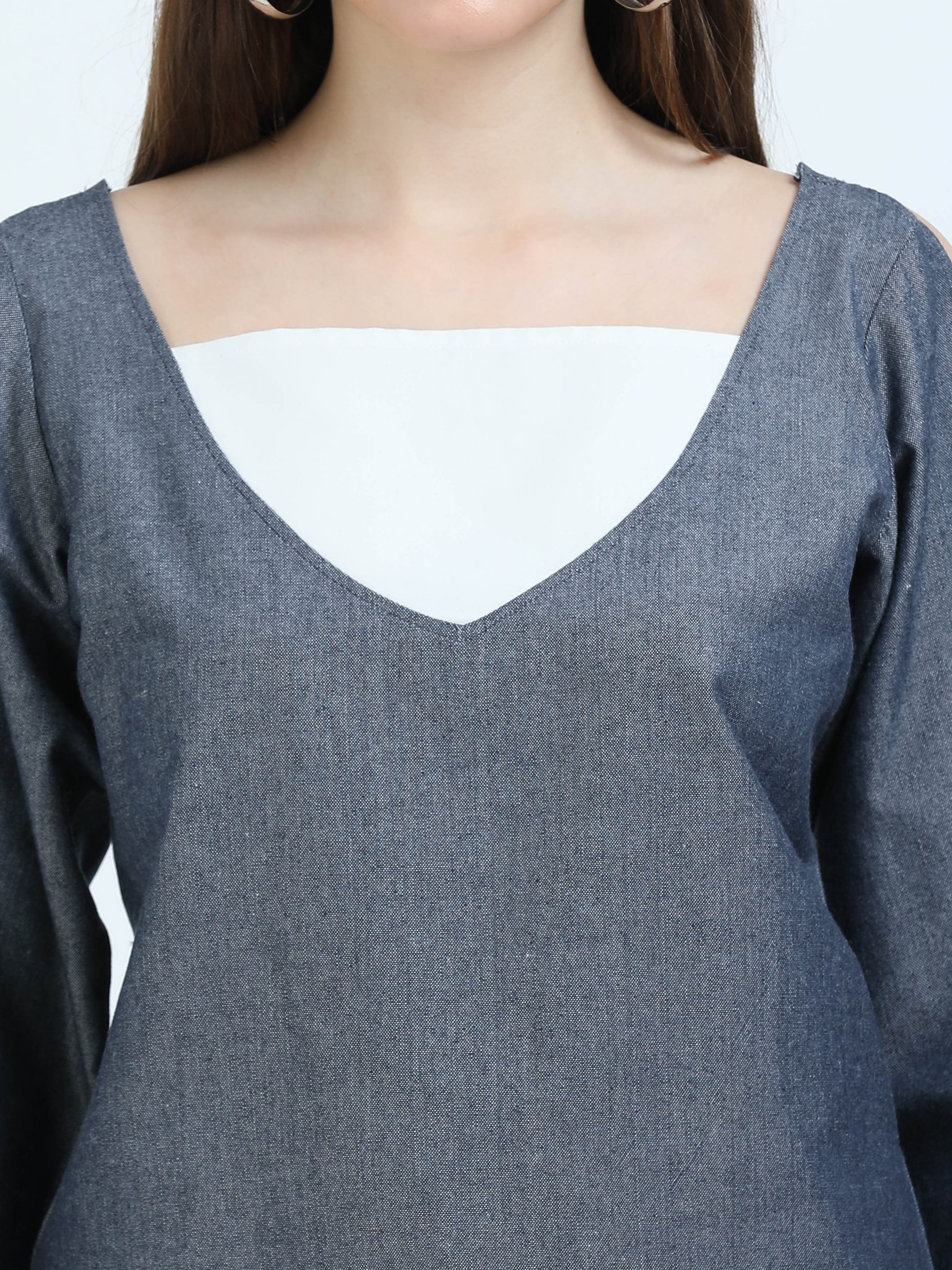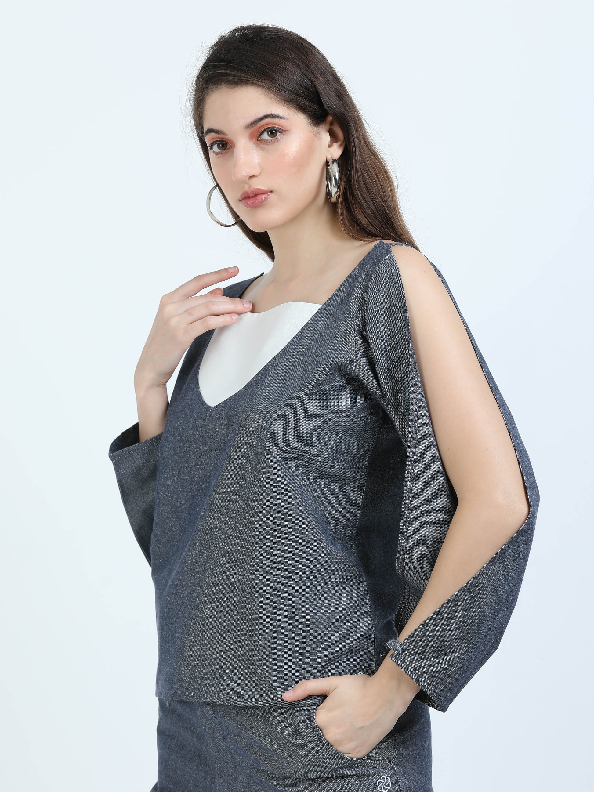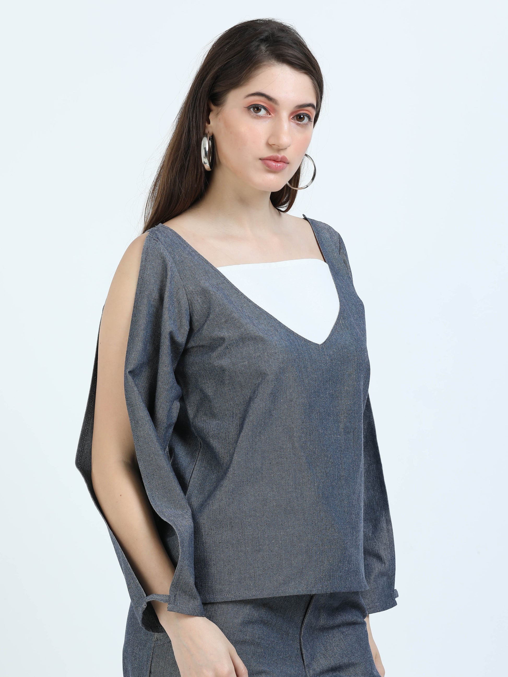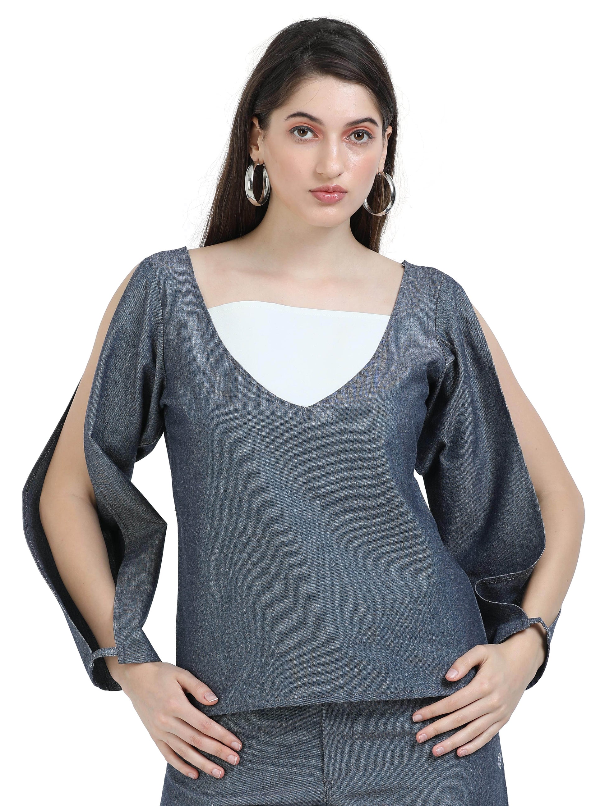 This is not your regular crop top. Designed with a bold deep-V neckline, cutout sleeves, and layered panel detailing, it delivers both edge and structure. The oversized sleeves balance perfectly with the cropped hem, drawing attention to the midriff and waist for a flattering finish. Thoughtful strap details add a playful touch, making this belly shirt a versatile top you can style with midi-skirts, swimwear, or casual outerwear. Whether worn as a statement piece or layered for a chic look, this crop top is a wardrobe essential for effortless style.
