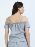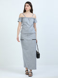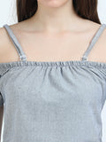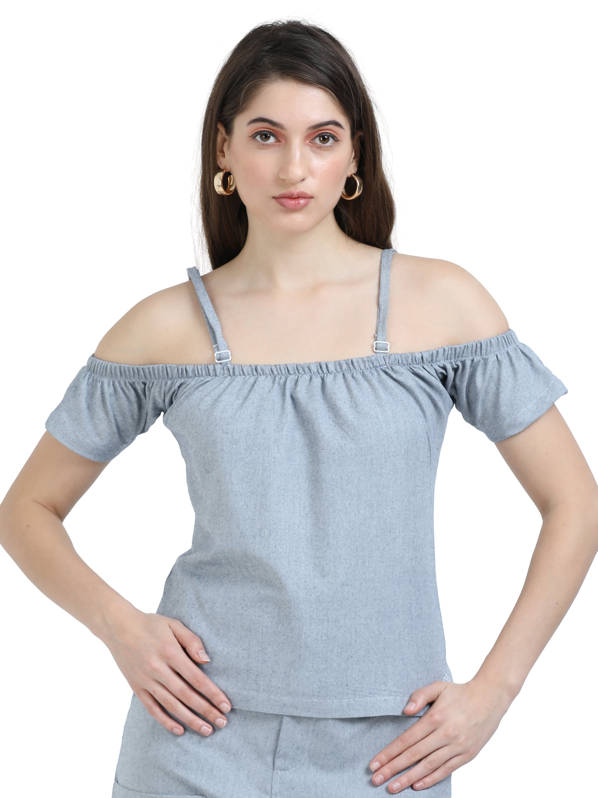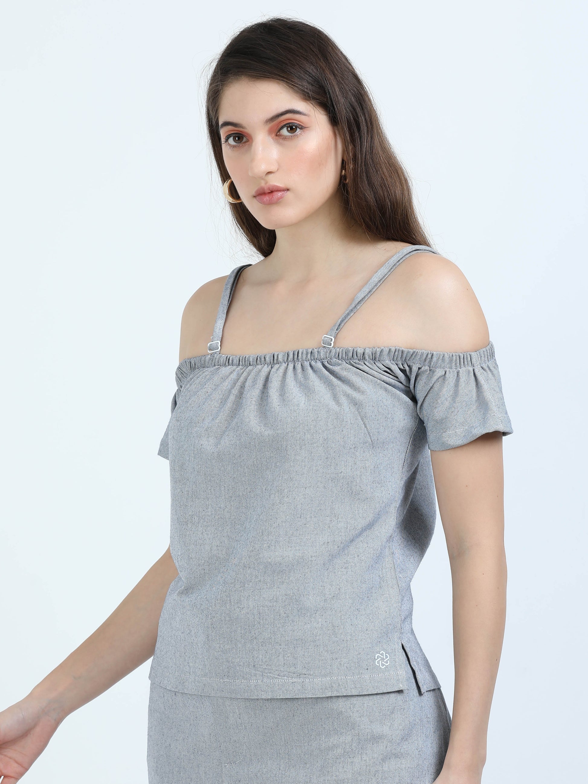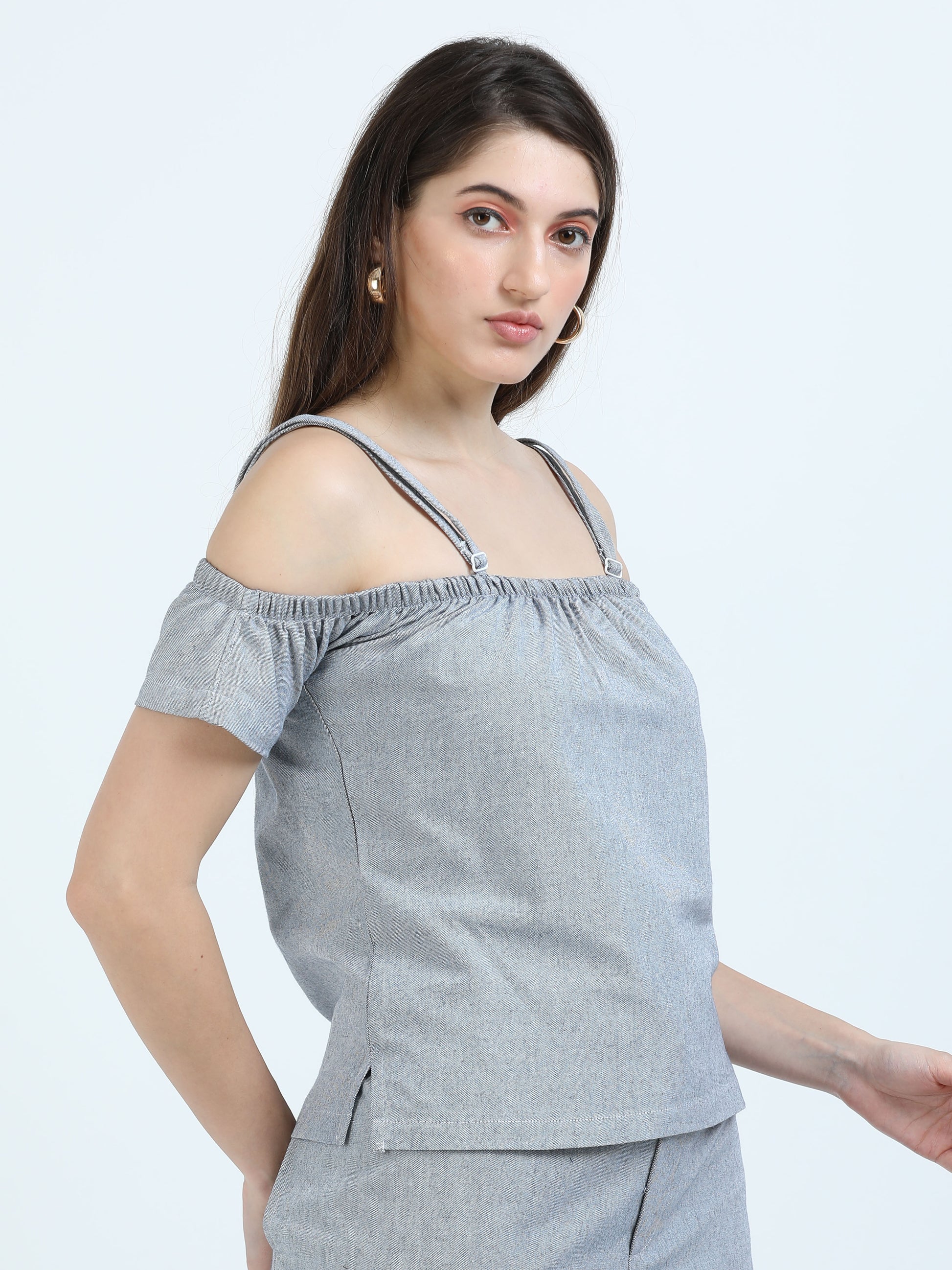 This crop top combines style and structure with an off-shoulder neckline supported by shoulder straps for comfort and flair. Crafted in light blue chambray, it highlights the midriff and waist, offering a flattering fit. Pair it effortlessly with midi-skirts, high-waisted trousers, or shorts for the perfect summer look. Designed for people who love effortless style, this versatile top ensures you wear it with confidence and ease.