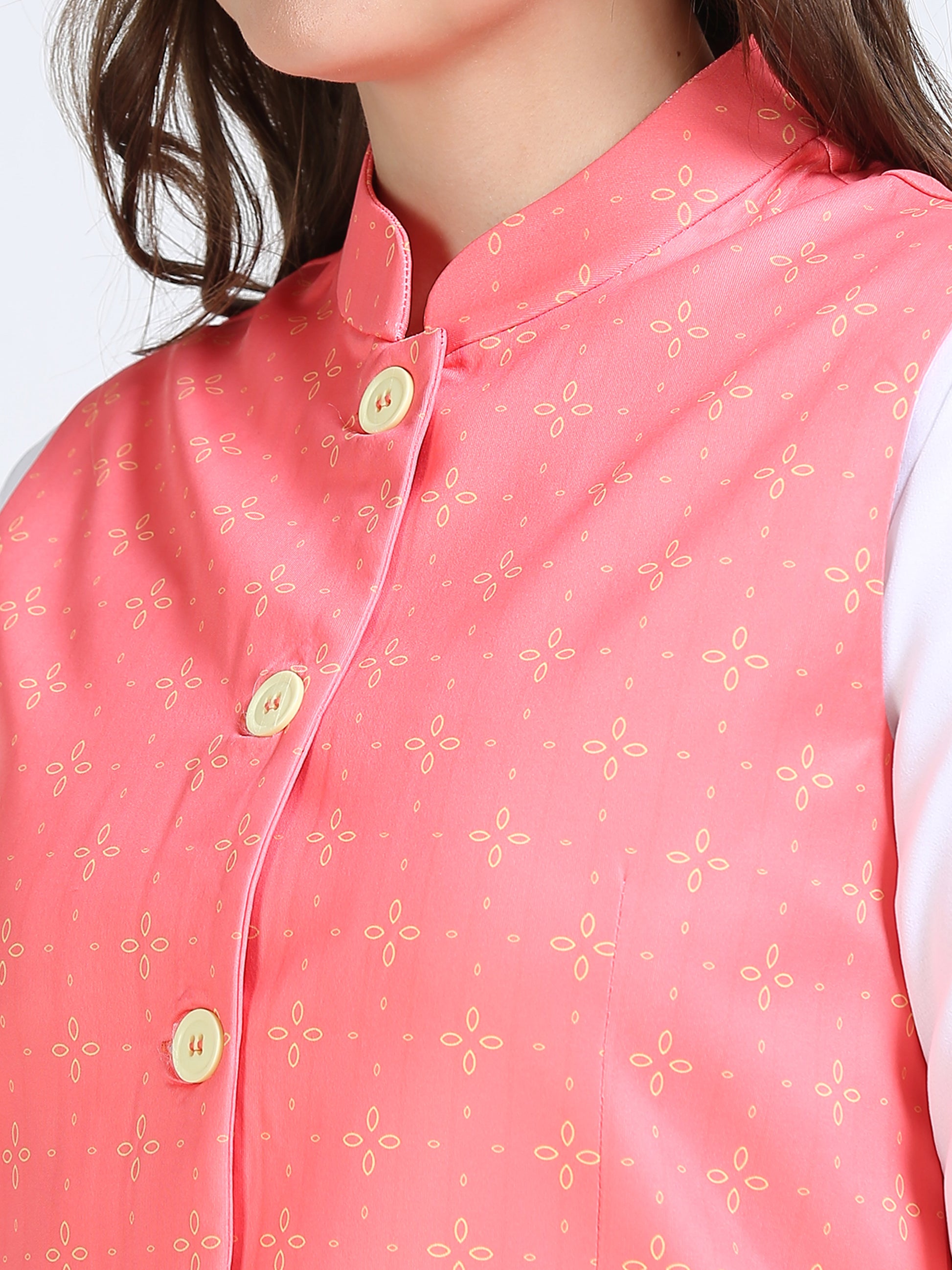 Add a modern twist to traditions with our Printed Modi Jacket, crafted from eco-friendly recycled fabrics. The sleek mandarin collar and tailored silhouette give it a sharp, structured look, while the all over print adds a touch of personality and contemporary flair.