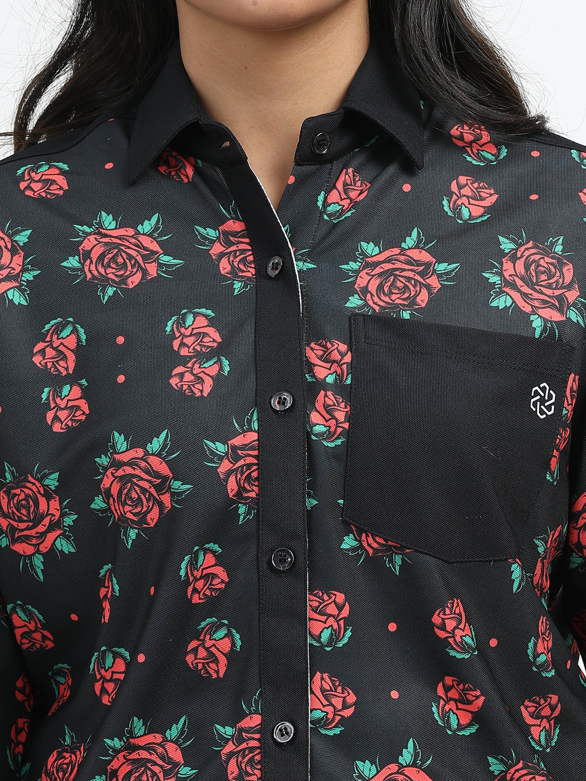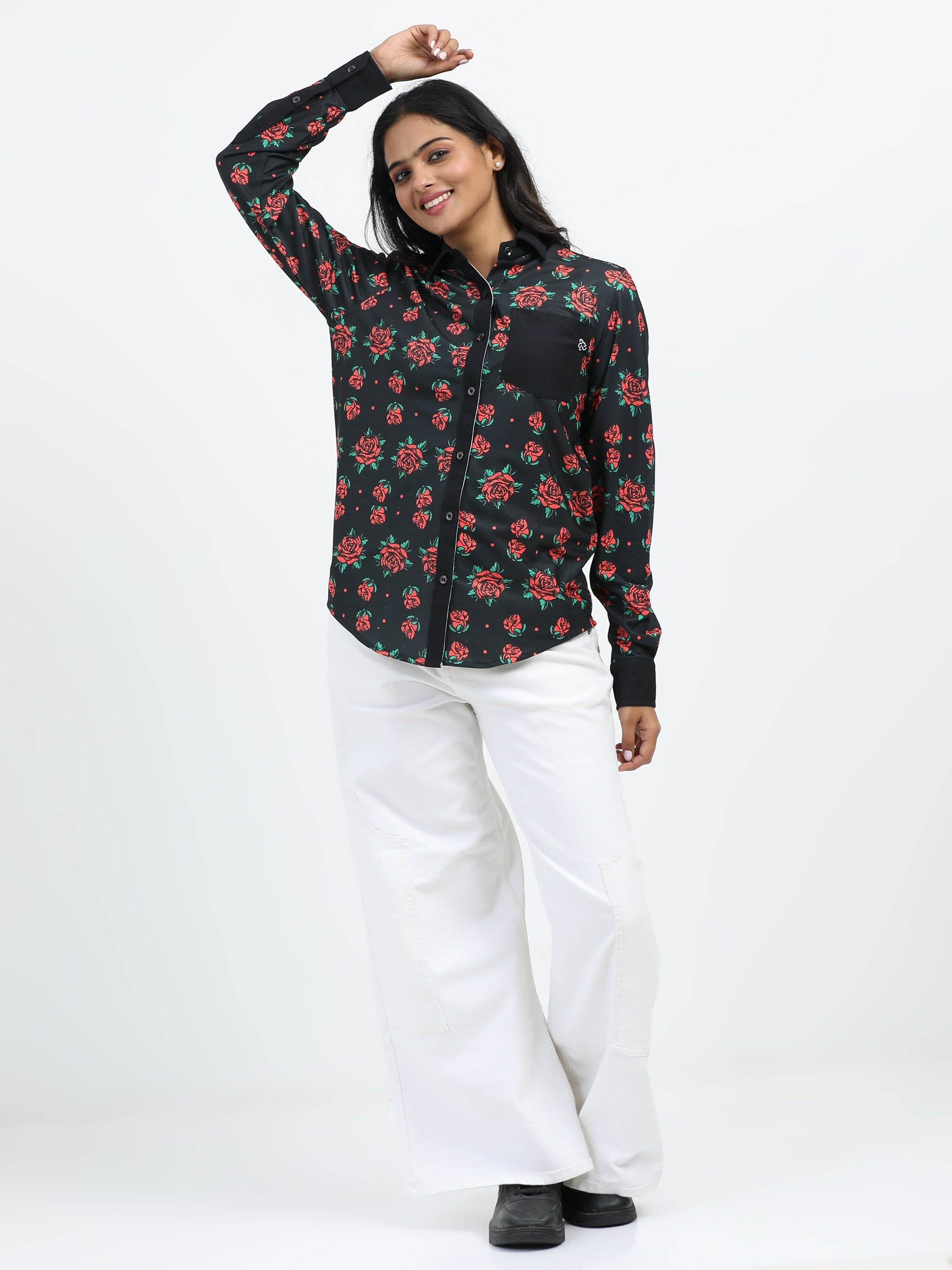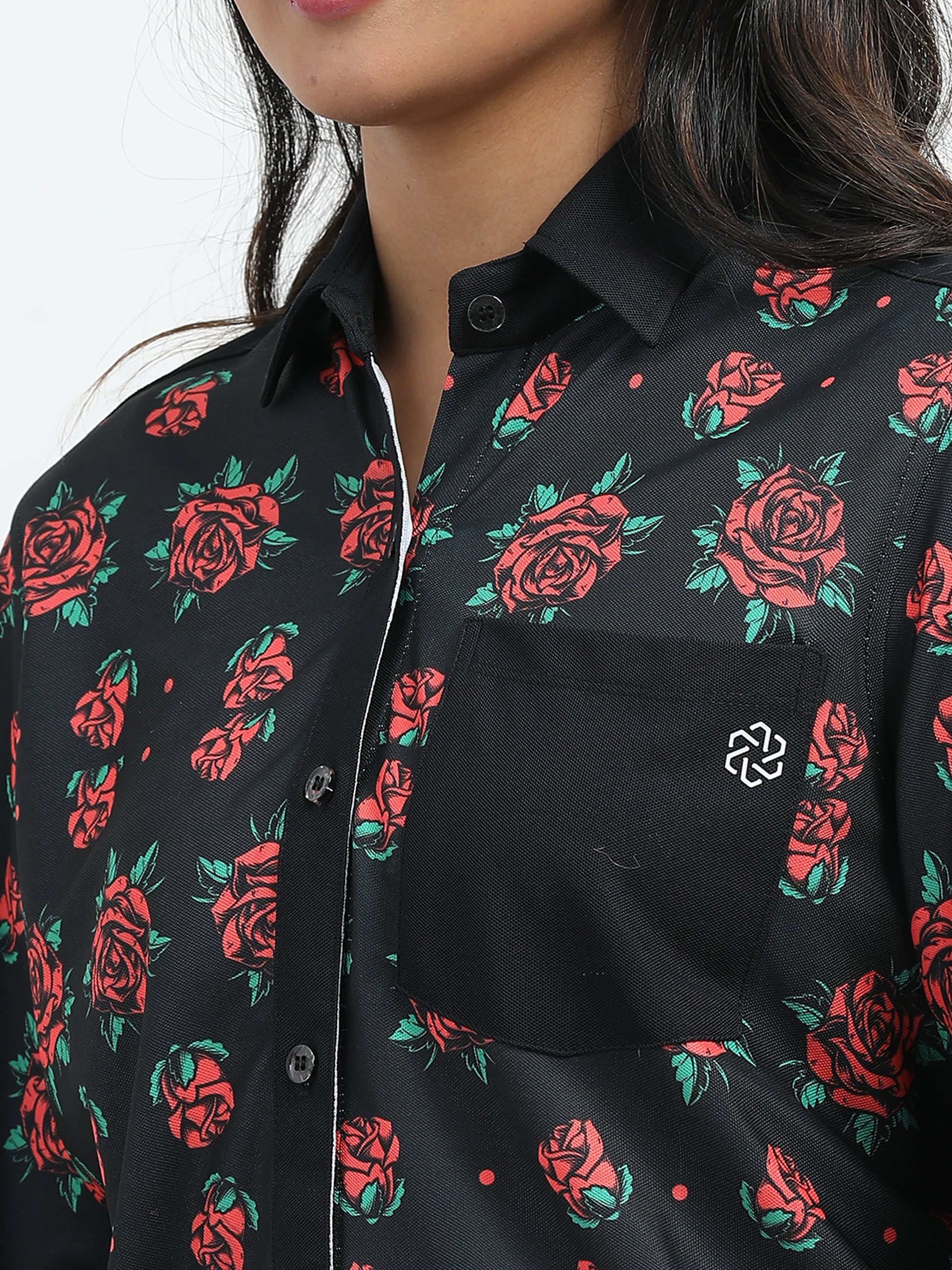 Whether you wanna twin with your partner or wear it by yourself this is the perfect shirt. Comfortable shirt with a contrast rose printed collar ,cuffs and pocket.