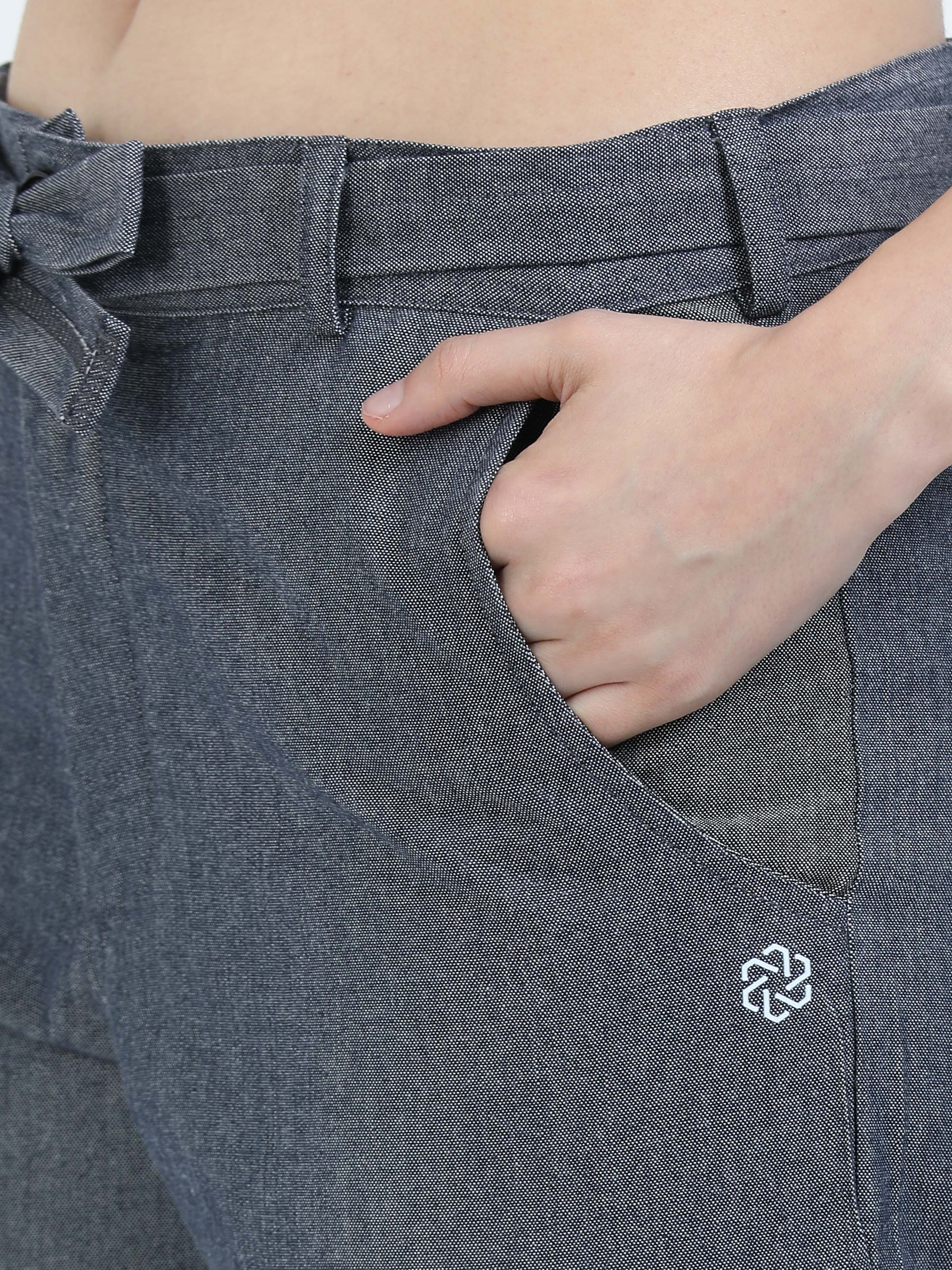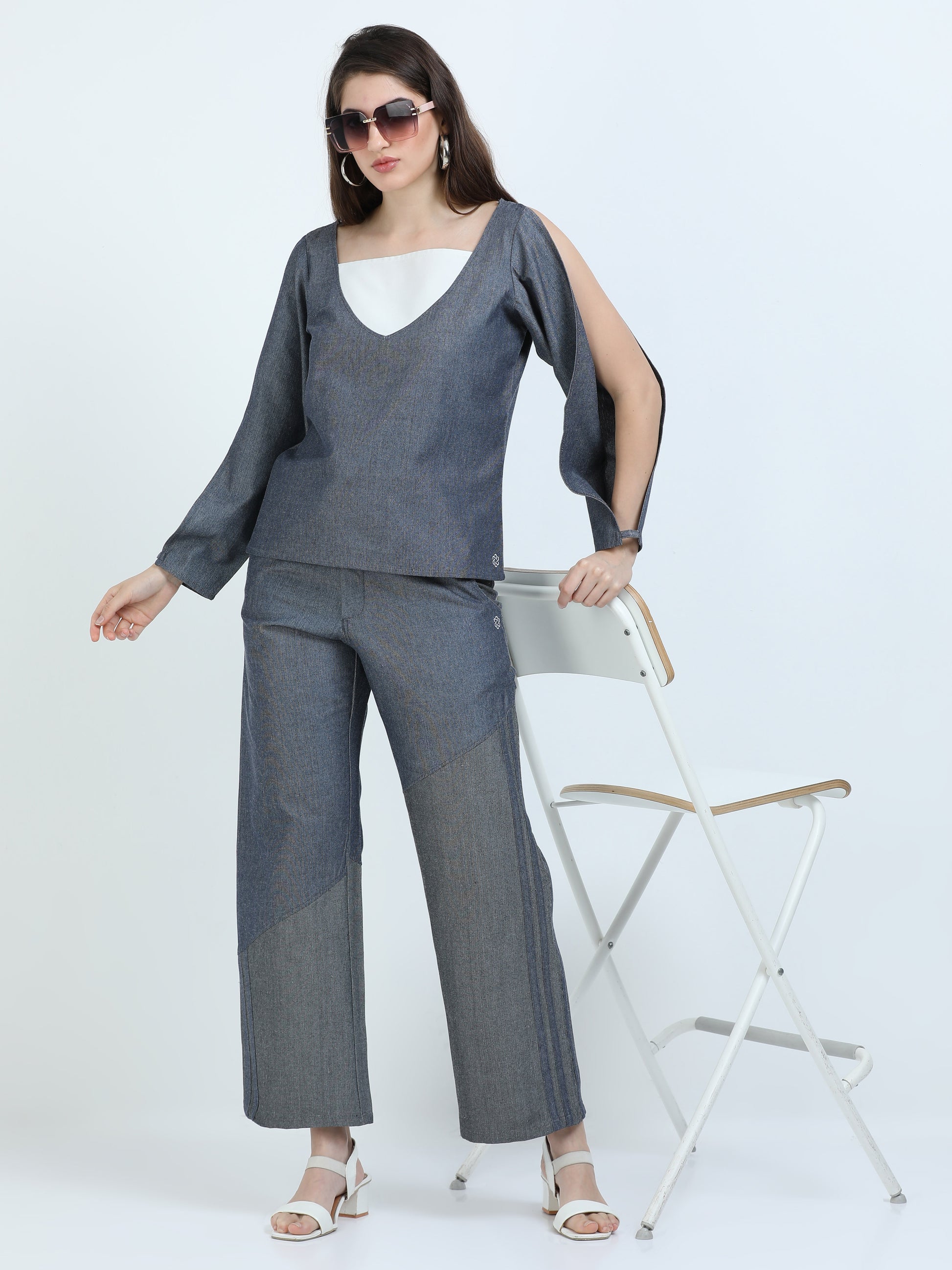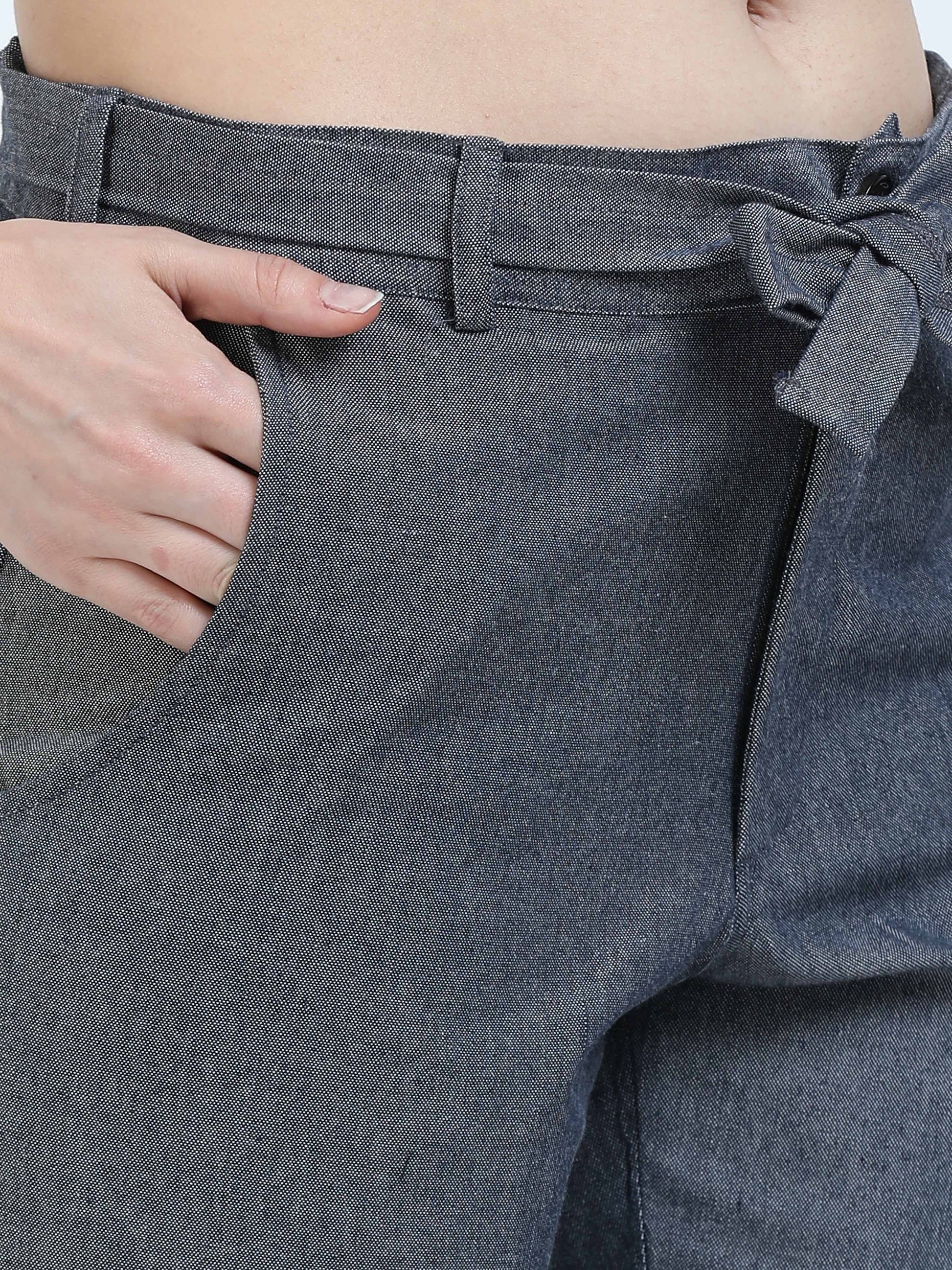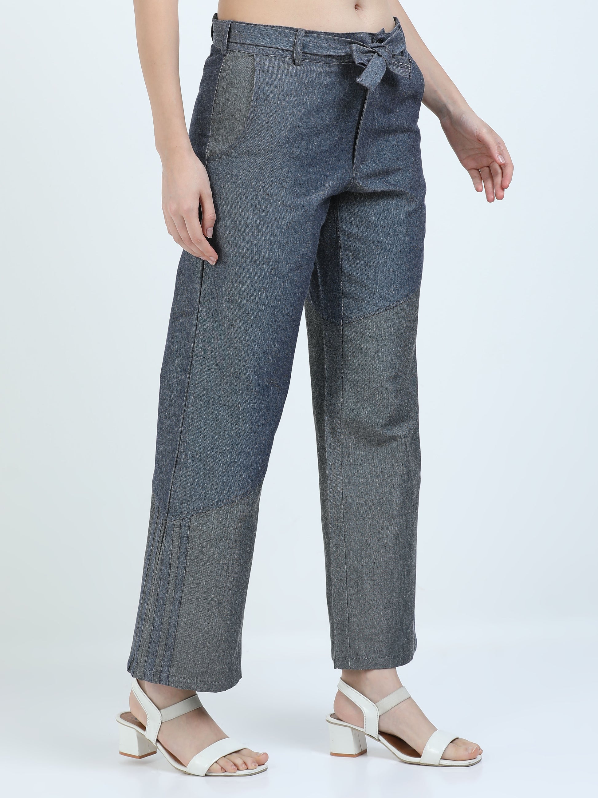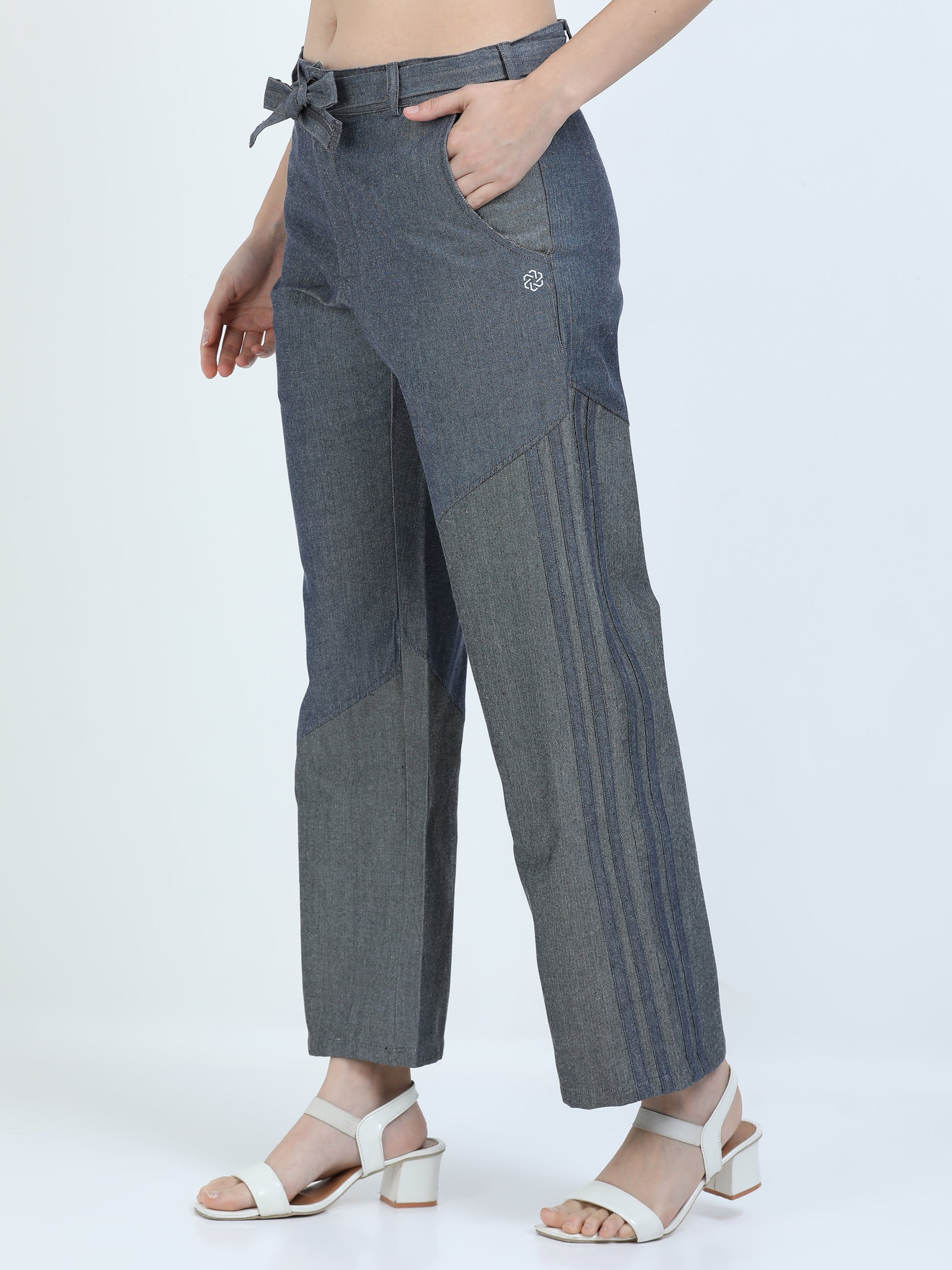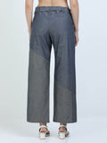 These wide leg pants are designed for movement and edge, these trousers feature bold diagonal cut panelling which adds visual intrigue and depth. The dark blue chambray, denim blend and woven fabrics give them a bold edgy look. The flared silhouette ensures ease and soft flow from the hips to the ankle. The stripes on the sides act as a bold fashion staple element. Perfect to make a quiet statement with clean geometry and lasting comfort.