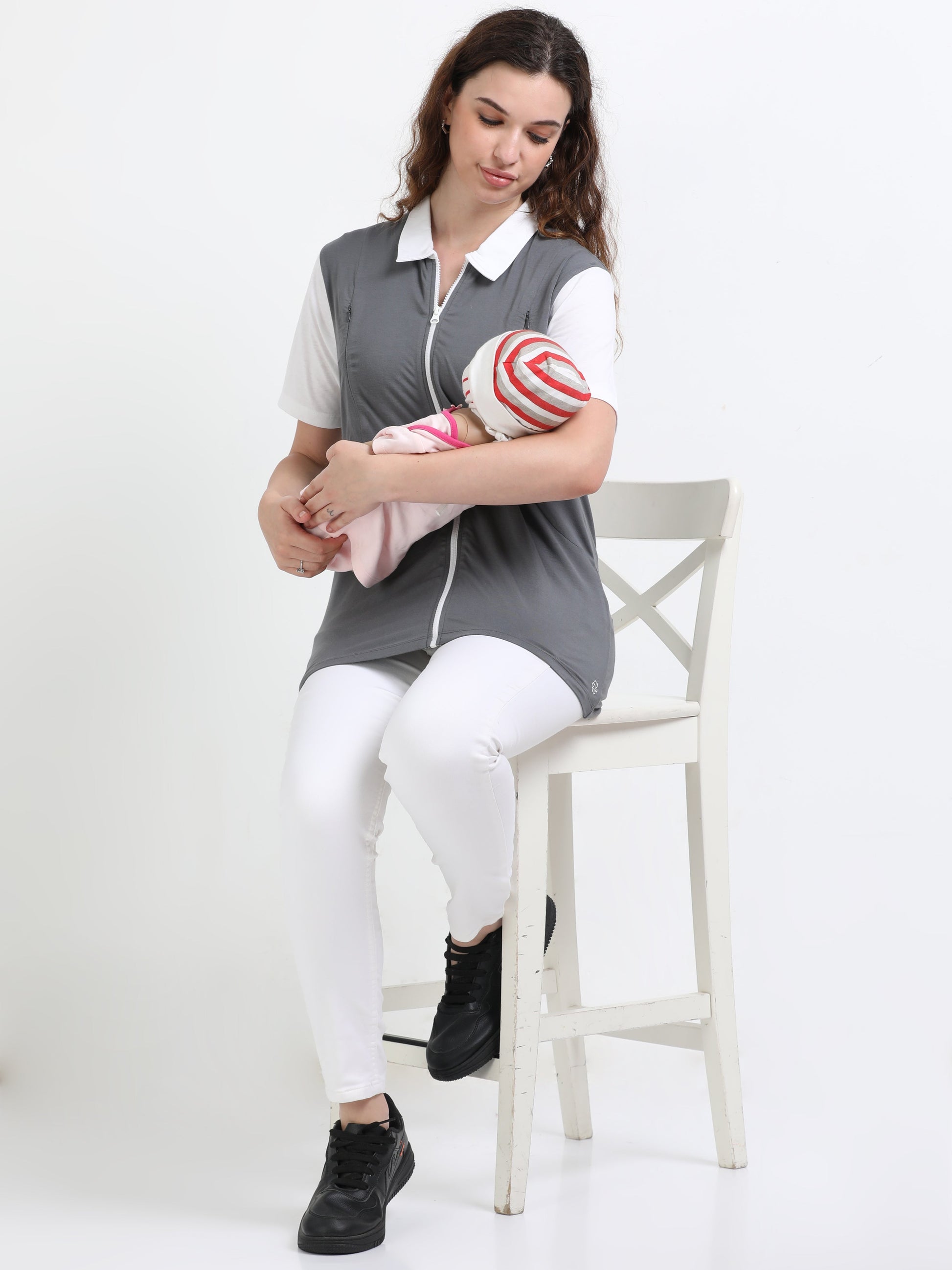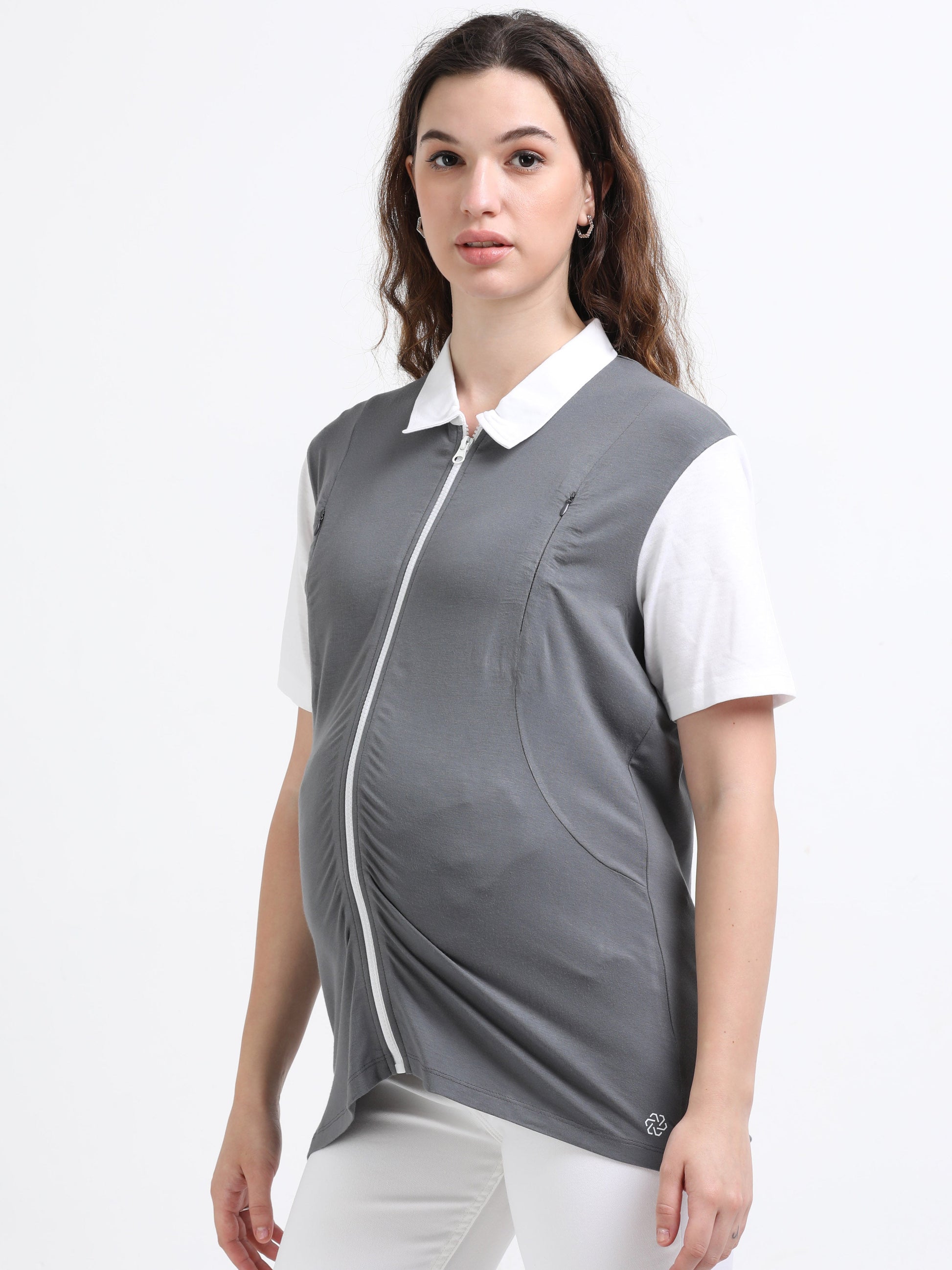 This zip front maternity shirt combines functionality with style. This versatile design can be worn during and post pregnancy. The front zip is the main closure for the garment along with which this design features two concealed zippers along the princess line making it comfortable for nursing without compramising on style and look. Crafted from Bamboo fabric - this maternity shirt offers superior comfort, breathability , moisture absorption and odor resistance. Perfect for working women who can and will have it all - making this a must have shirt for women that can be used well beyond your maternity period.